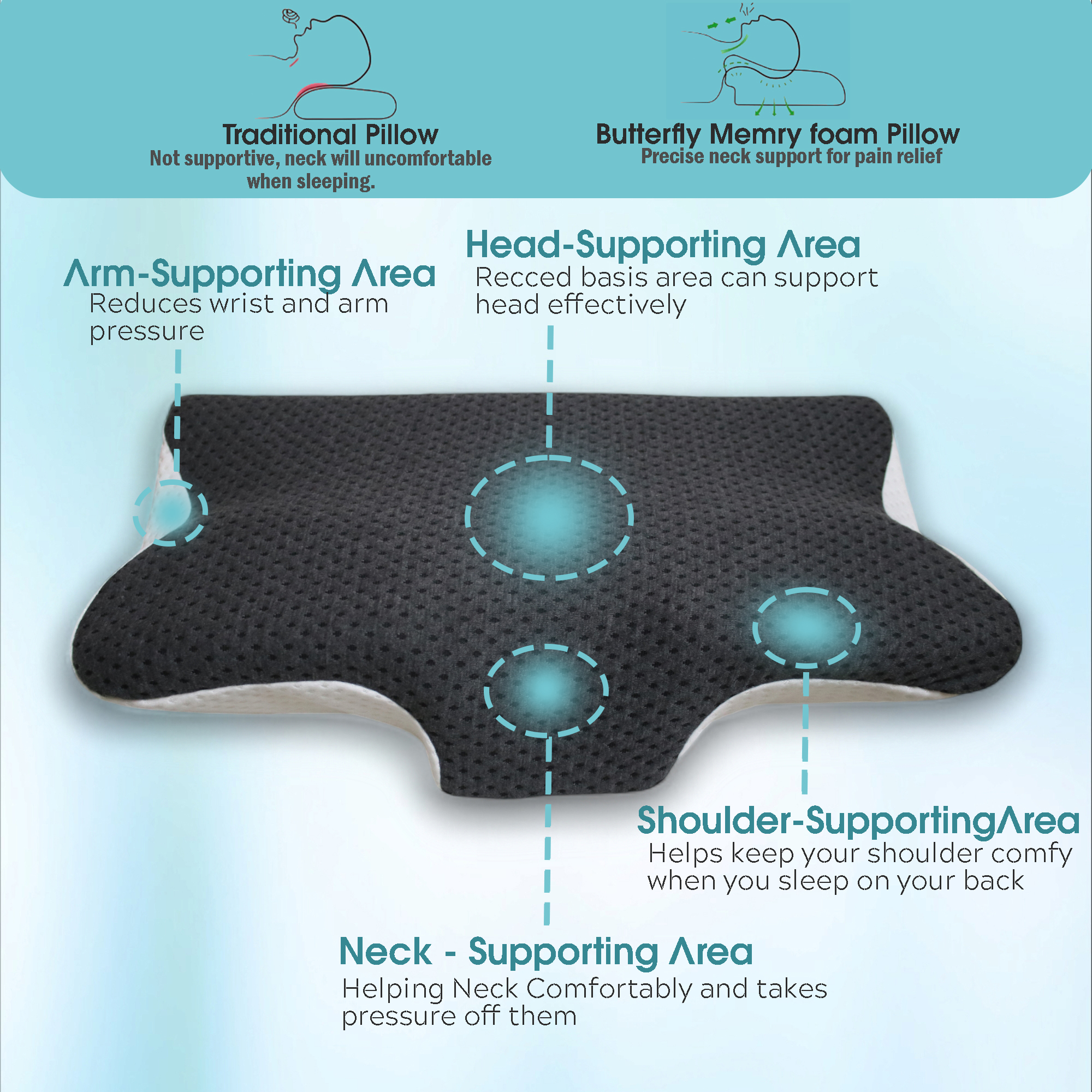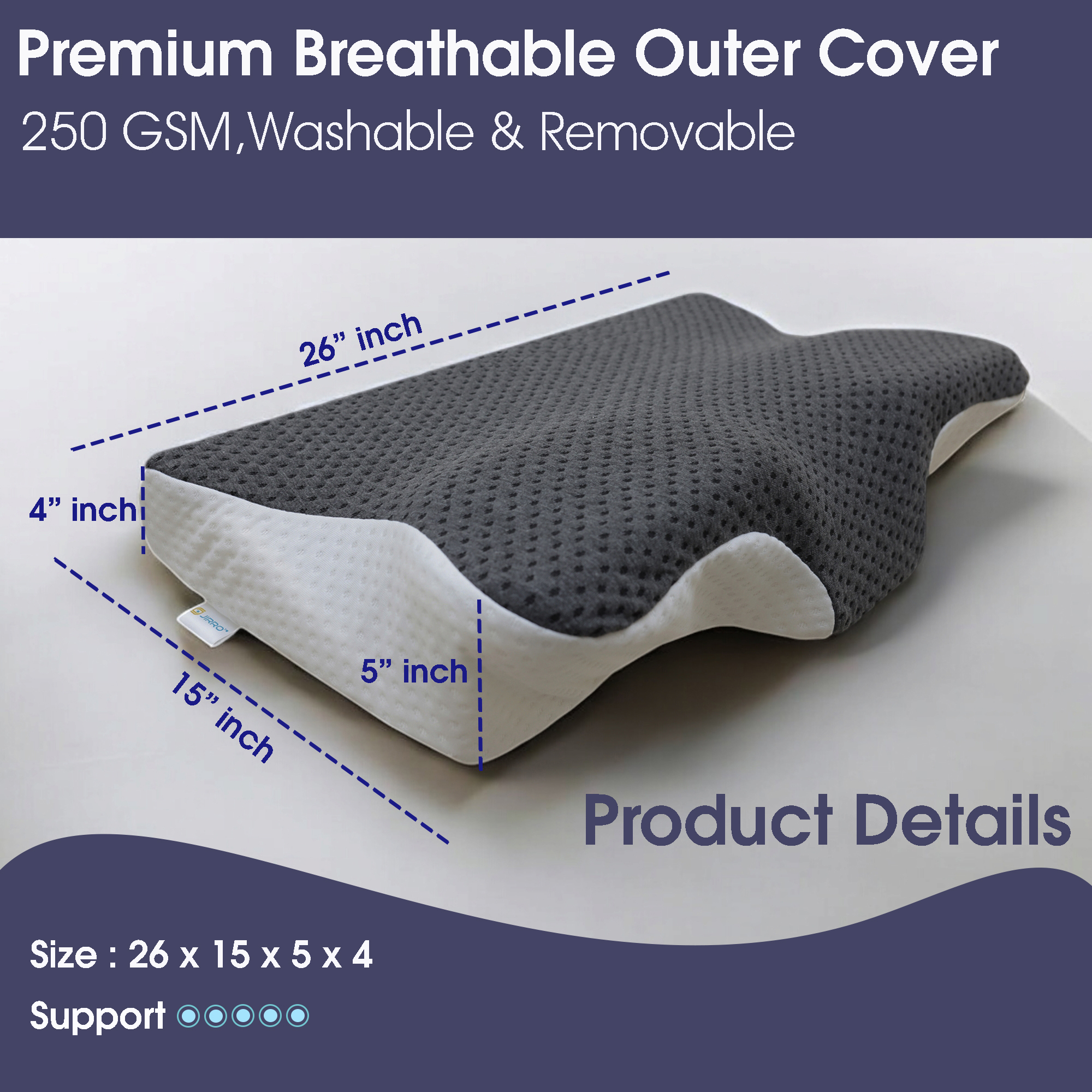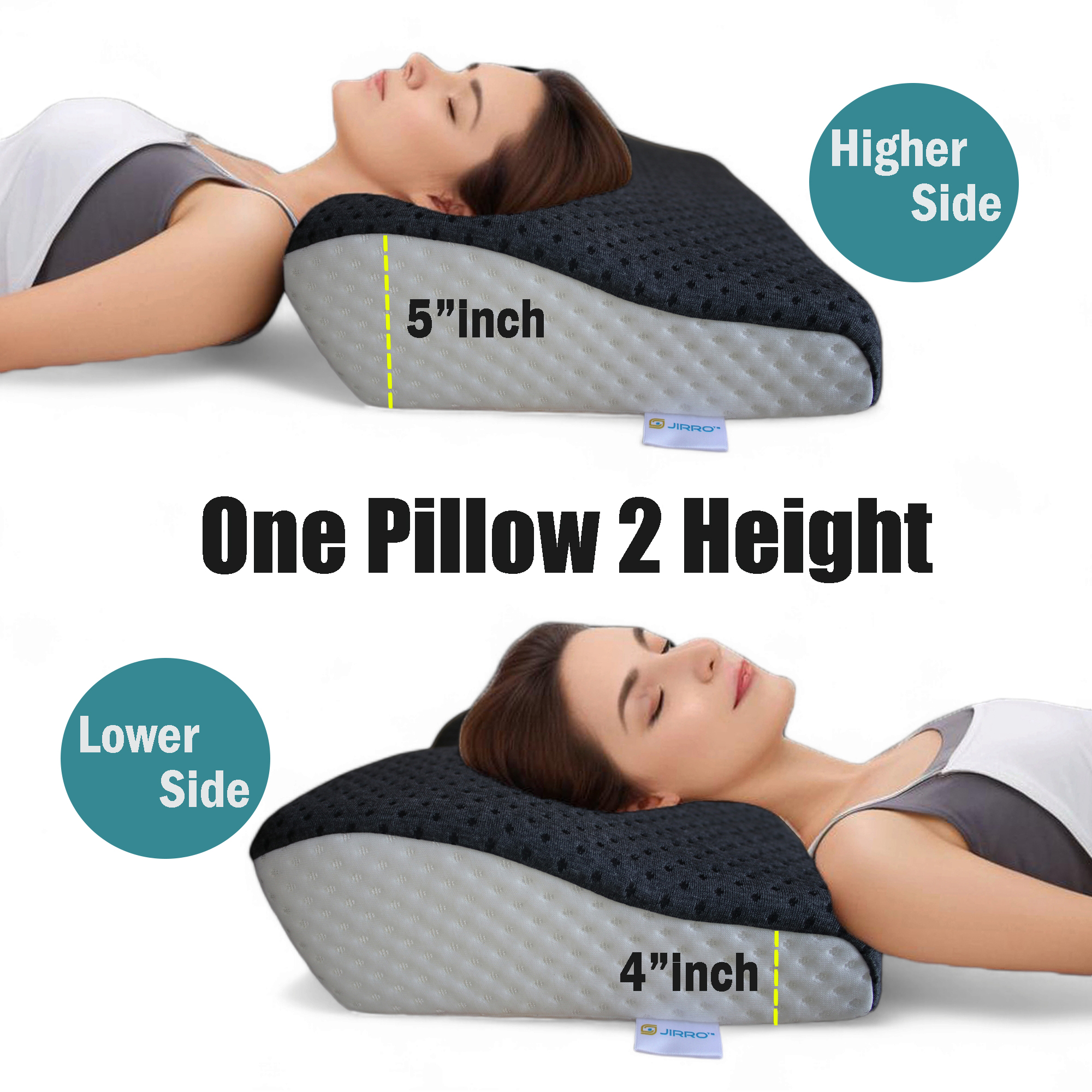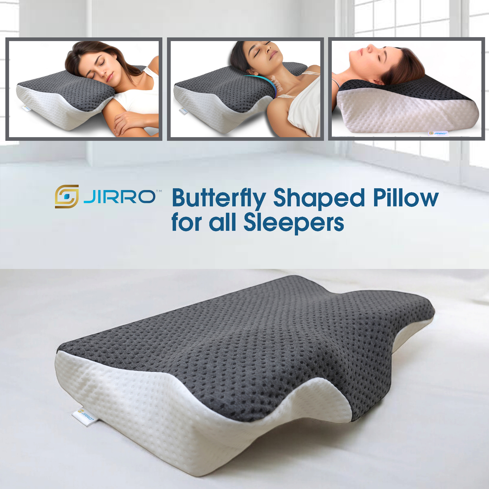 JIRRO Butterfly Orthopedic Cervical Pillow - Memory Foam Neck & Shoulder Pain Relief, Ergonomic Contour with Arm Rest, Dual Height Support, Ideal for All Sleep Positions. 26x15x5 Inch(White & Grey)