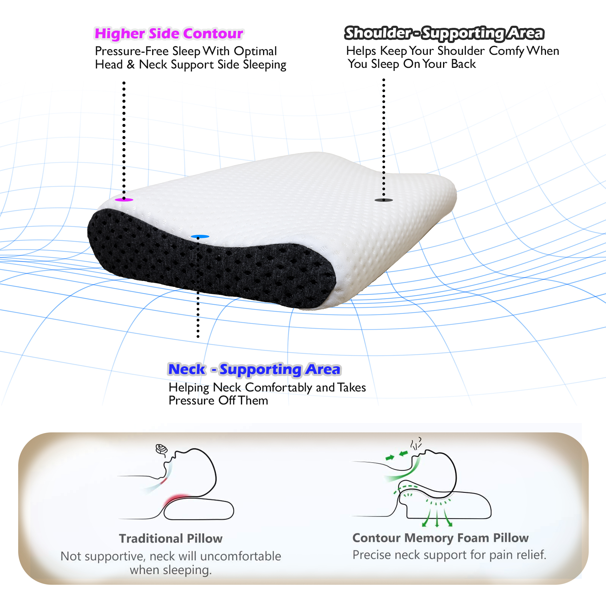 • Functional and Durable: Made from durable memory foam, it maintains its shape over time, resisting flattening and ensuring enduring comfort. The unique contoured design supports a healthy sleeping posture, helping you wake up without discomfort.
